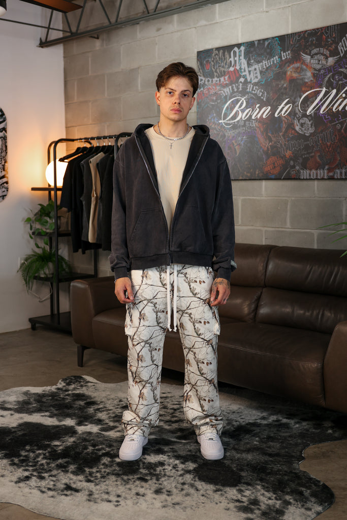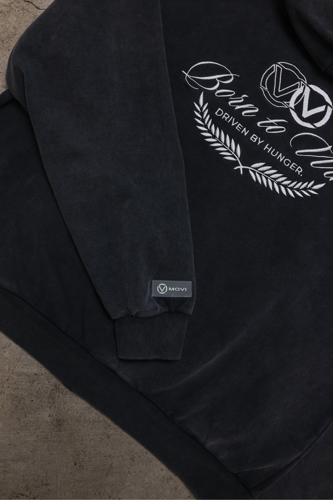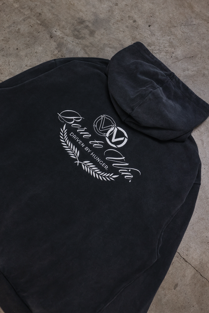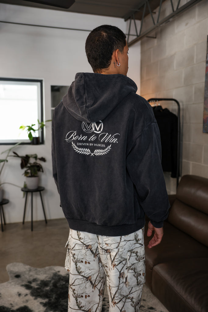 Ultra-Luxury, Boxy, Heavyweight Zip-Up Hoodie. Features a washed black fabric for a vintage look and unique finish. Oversized Embroidered Born to Win Legacy logo detail along back, as well as Silver metallic YKK luxury zippers for a smooth, effortless zip-up or open. Full French Terry (450GSM) construction. A hoodie you won't want to take off.